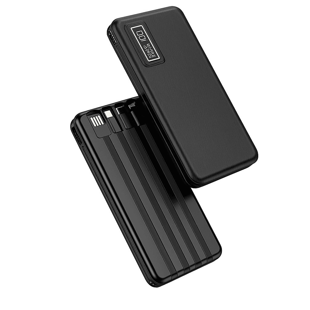 🔌 4-in-1 Design: Built-in cables (Type-C, Micro USB, Lightning, USB-A).